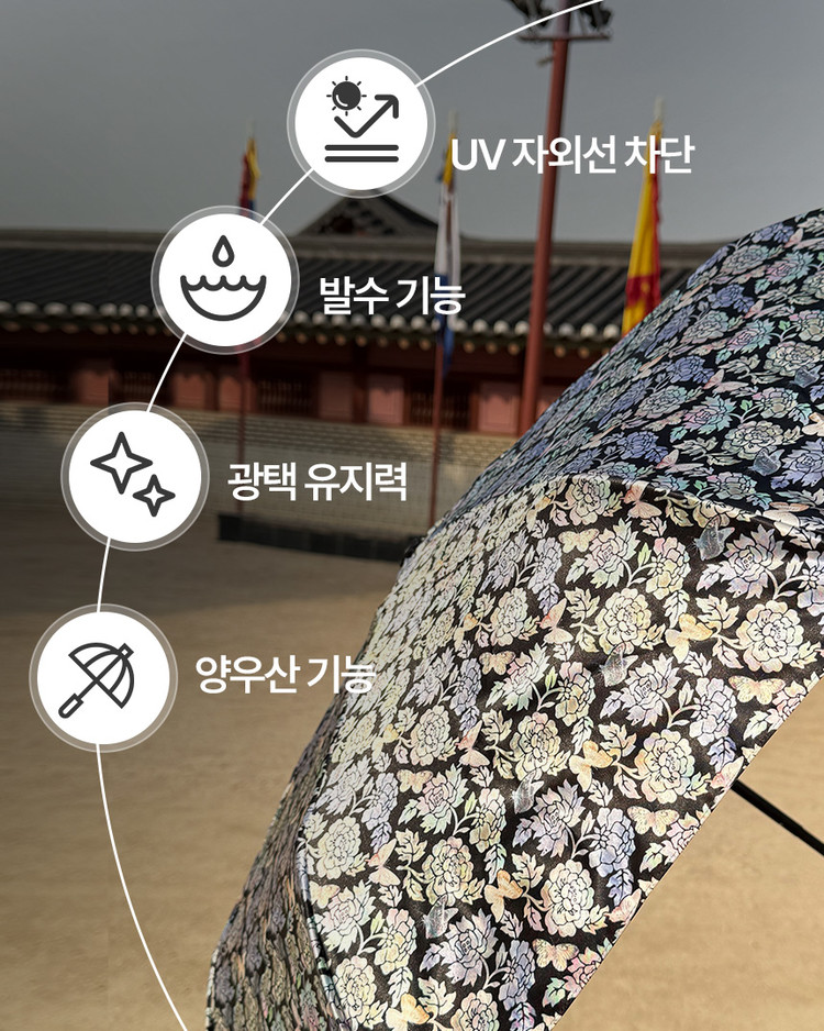 [필독] 시중의 일반적인 우산처럼 홀랑홀랑~ 얇거나,아주 가볍거나 하지는 않습니다. 자개문양 반짝이에, 발수 코팅에, UV코팅에 다양한 기능을 넣다 보니, 아주 튼튼!! 하게 도톰하오니, 이점 꼭 숙지해주시고, 신중한 구매 부탁드립니다.!