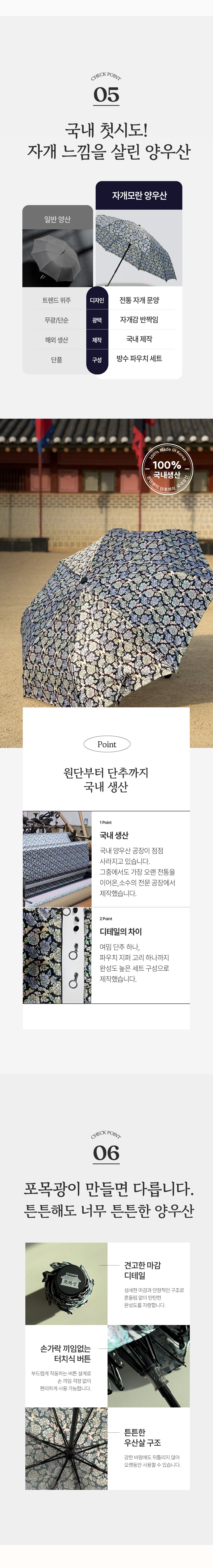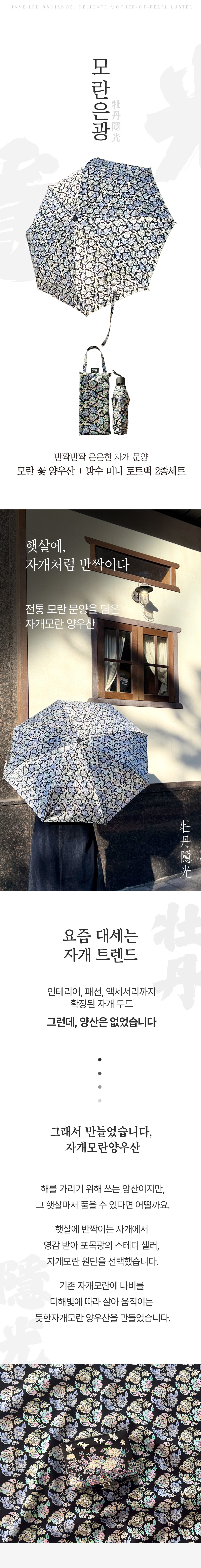 원단부터 직접 제작하여, 빛에 따라 은은하게 반짝이는 자개 문양의 고급스러움을 그대로 양우산에 담았습니다. 원단부터 개발을 하였기 때문에 전세계에서 포목광에서만 이런 자개 느낌의 양우산을 만나 볼수가 있습니다. 뿌듯~
