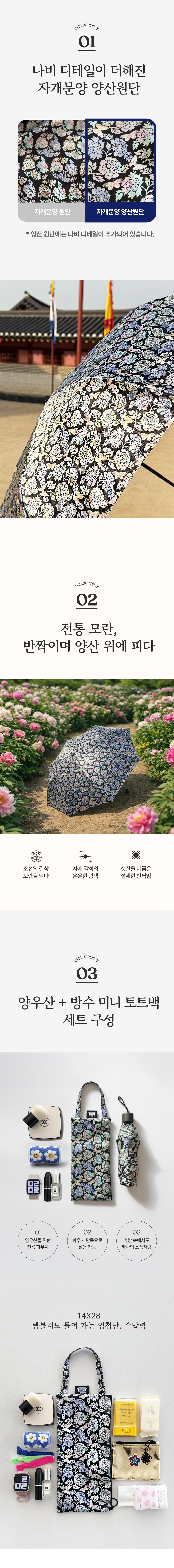 함께 구성된 방수 자개 문양 미니 토트백은 양우산 보관은 물론, 화장품·소지품 파우치 등 다양한 용도로 고급스럽게 활용하실 수 있습니다.
